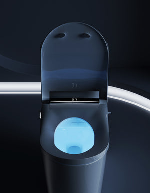 After washing, the warm air dryer dries the area without toilet paper. A carbon deodorizing system absorbs odors, supported by continuous air circulation and a refillable fragrance module. A motion-activated LED night light provides visibility in low light.